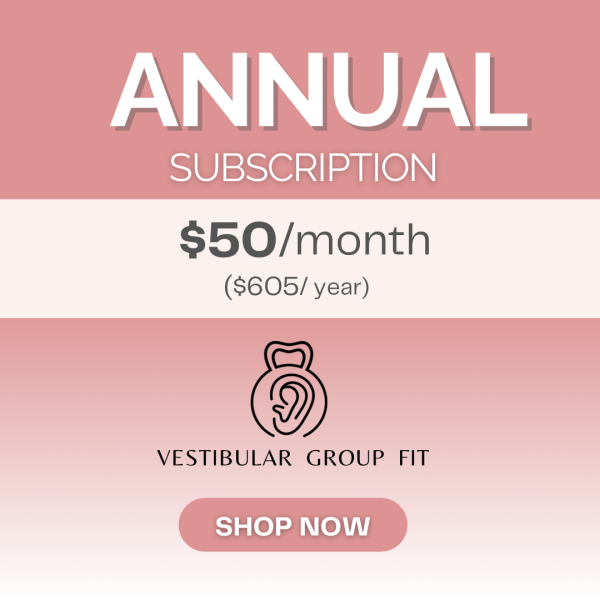 Treat yourself to the Vestibular Group Fit annual subscription. It is the only group exercise program designed to help you decrease dizziness, improve your balance, and increase your day-to-day function. Dizziness is incredibly debilitating, it prevents you from moving the way you want, exercising, driving, and more! Vestibular Group Fit is created using the principles from Vestibular Rehabilitation Therapy, but in a group setting meant to support you on your journey to recovery.