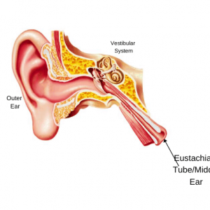 Your middle ear is basically a balloon filled with air, regulated by the ear canal called the eustachian tube. The eustachian tube, in the photo below, is the piece that looks like Florida (I mean really, it does!). That piece is closed at baseline, but opens and shuts when you pop your ear. Your ear is supposed to pop, that’s normal! It helps you regulate the pressure and volume of the amount of air in your inner ear at any given time. Within the balloon piece of the inner ear are also the 3 tiny bones called the malleus, incus, and stapes. These three bones knock against and vibrate on each other to help send sound, in the form of vibration, to your inner ear. This is a big part of how we hear!